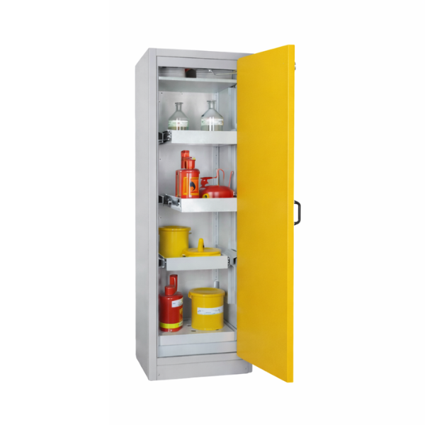 Szafa ognioodporna 30 min, przeznaczona do pasywnego, bezpiecznego przechowywania materiałów łatwopalnych w pomieszczeniach roboczych, takich jak hale produkcyjne, warsztaty czy magazyny zakładowe, w bezpośrednim sąsiedztwie stanowiska pracy. Niezbędne rozwiązanie spełniające najwyższe standardy, przepisy i normy polskie oraz europejskie. Dzięki zastosowaniu wysuwanych półek, szafa umożliwia szybki i bezpieczny dostęp do przechowywanych materiałów, minimalizując ryzyko kontaktu z substancjami niebezpiecznymi i zagrożenie pożarowe oraz znacząco ułatwiając organizację przestrzeni roboczej.