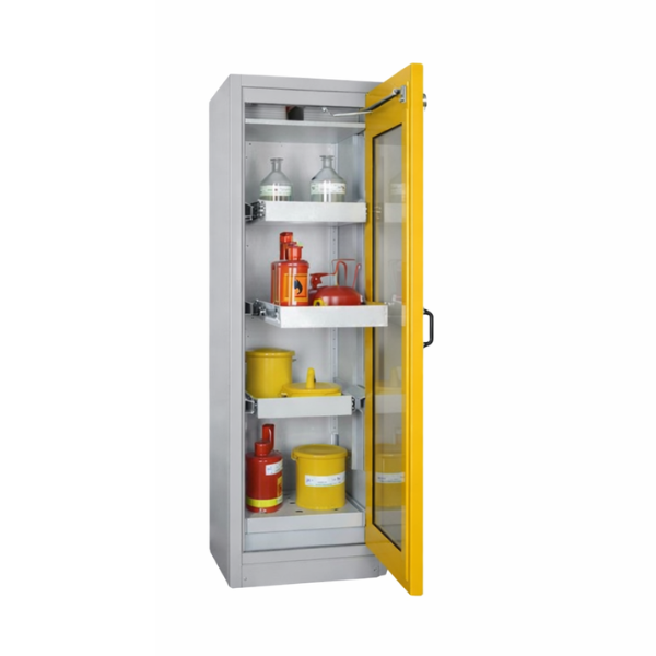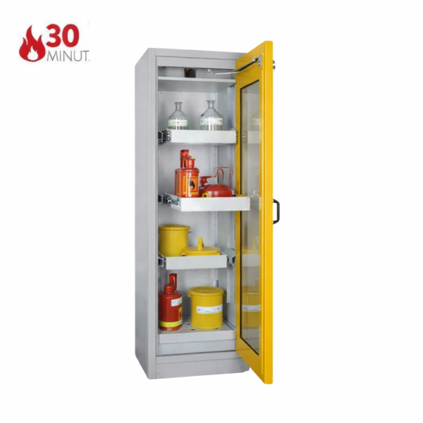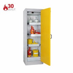 Szafa ognioodporna 30 min, przeznaczona do pasywnego, bezpiecznego przechowywania materiałów łatwopalnych w pomieszczeniach roboczych, takich jak hale produkcyjne, warsztaty czy magazyny zakładowe, w bezpośrednim sąsiedztwie stanowiska pracy. Niezbędne rozwiązanie spełniające najwyższe standardy, przepisy i normy polskie oraz europejskie. Dzięki zastosowaniu wysuwanych półek, szafa umożliwia szybki i bezpieczny dostęp do przechowywanych materiałów, minimalizując ryzyko kontaktu z substancjami niebezpiecznymi i zagrożenie pożarowe oraz znacząco ułatwiając organizację przestrzeni roboczej.