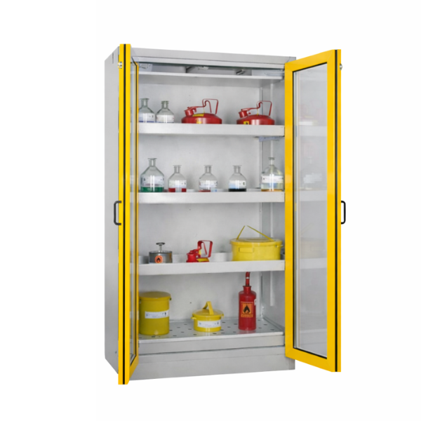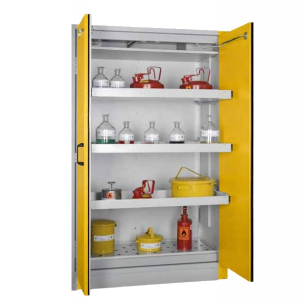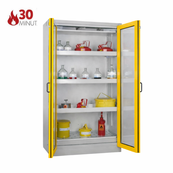 Szafa ognioodporna 30 min, przeznaczona do pasywnego, bezpiecznego przechowywania materiałów łatwopalnych w pomieszczeniach roboczych, takich jak hale produkcyjne, warsztaty czy magazyny zakładowe, w bezpośrednim sąsiedztwie stanowiska pracy. Niezbędne rozwiązanie spełniające najwyższe standardy, przepisy i normy polskie oraz europejskie. Dzięki zastosowaniu wysuwanych półek, szafa umożliwia szybki i bezpieczny dostęp do przechowywanych materiałów, minimalizując ryzyko kontaktu z substancjami niebezpiecznymi i zagrożenie pożarowe oraz znacząco ułatwiając organizację przestrzeni roboczej.