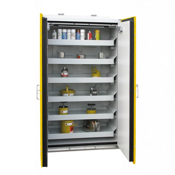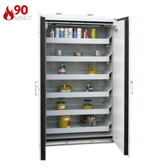 Szafa ognioodporna 90 min, przeznaczona do pasywnego, bezpiecznego przechowywania materiałów łatwopalnych w pomieszczeniach roboczych, takich jak hale produkcyjne, warsztaty czy magazyny zakładowe, w bezpośrednim sąsiedztwie stanowiska pracy. Niezbędne rozwiązanie spełniające najwyższe standardy, przepisy i normy polskie oraz europejskie. Dzięki zastosowaniu wysuwanych półek (tac) szafa umożliwia szybki i bezpieczny dostęp do przechowywanych materiałów, minimalizując ryzyko kontaktu z substancjami niebezpiecznymi i zagrożenie pożarowe oraz znacząco ułatwiając organizację przestrzeni roboczej.