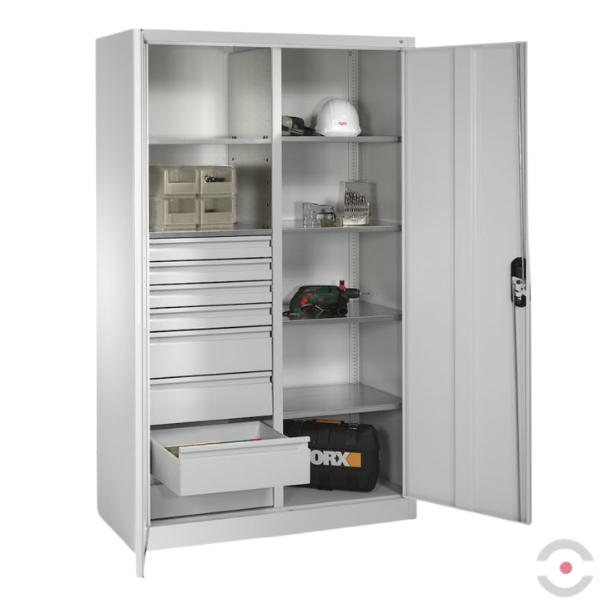 Szafa magazynowa to trwałe i funkcjonalne rozwiązanie stworzone z myślą o bezpiecznym przechowywaniu narzędzi, akcesoriów oraz wyposażenia technicznego bezpośrednio na stanowisku pracy. Szafa została zaprojektowana jako model stojący o dużej pojemności, dzięki czemu sprawdzi się w warsztatach, magazynach czy strefach produkcyjnych, zapewniając wygodny dostęp do całego wnętrza.