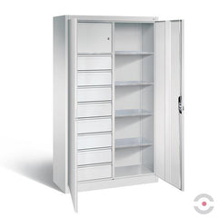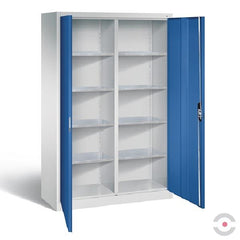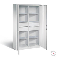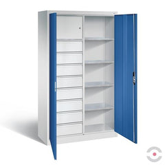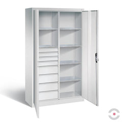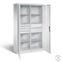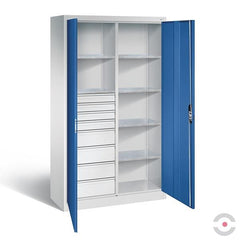 Stalowa szafa warsztowa z różnorodnym wyposażeniem wnętrza z drzwiami dwuskrzydłowymi posiada ocynkowane półki oraz szuflady, szafa Seria 89.