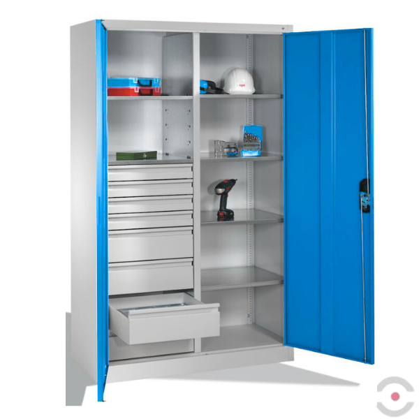 Szafa magazynowa to trwałe i funkcjonalne rozwiązanie stworzone z myślą o bezpiecznym przechowywaniu narzędzi, akcesoriów oraz wyposażenia technicznego bezpośrednio na stanowisku pracy. Szafa została zaprojektowana jako model stojący o dużej pojemności, dzięki czemu sprawdzi się w warsztatach, magazynach czy strefach produkcyjnych, zapewniając wygodny dostęp do całego wnętrza.