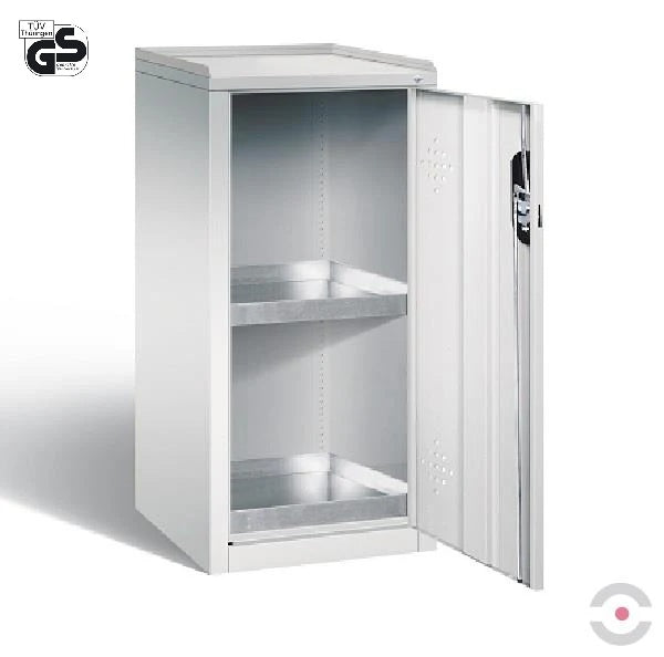 - 2 wyjmowane, ocynkowane tace ociekowe (ok. 10 l każda) – zabezpieczają przed wyciekami i ułatwiają kontrolę nad magazynowanymi substancjami