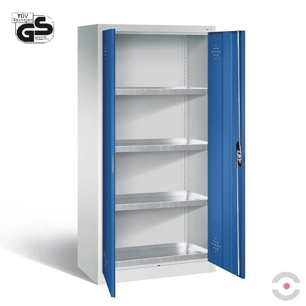 - 4 wyjmowane, ocynkowane tace ociekowe (ok. 20 l każda) – zabezpieczają przed wyciekami i ułatwiają kontrolę nad magazynowanymi substancjami