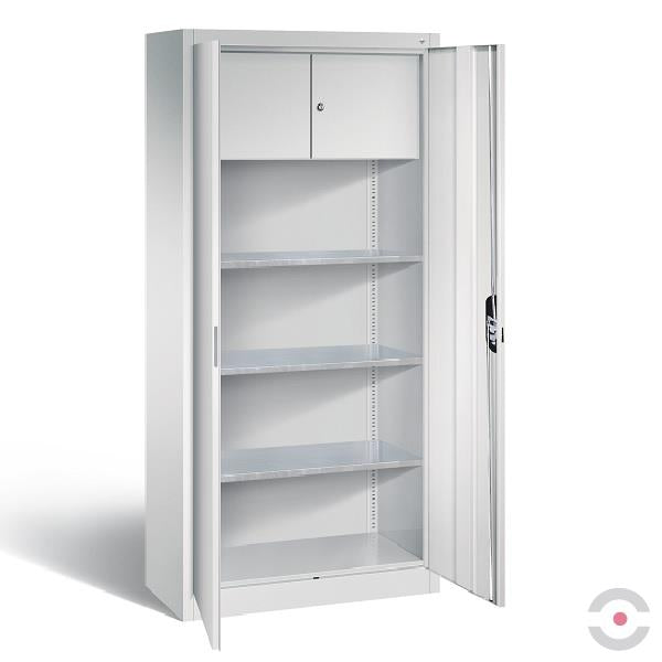 Stalowa szafa ze skarbczykiem Seria 89, wyposażona w dwuskrzydłowe drzwi i ocynkowane półki, to produkt o wysokiej jakości i funkcjonalności. Jej design łączy w sobie odporność na zużycie z praktycznym i estetycznym wykończeniem.