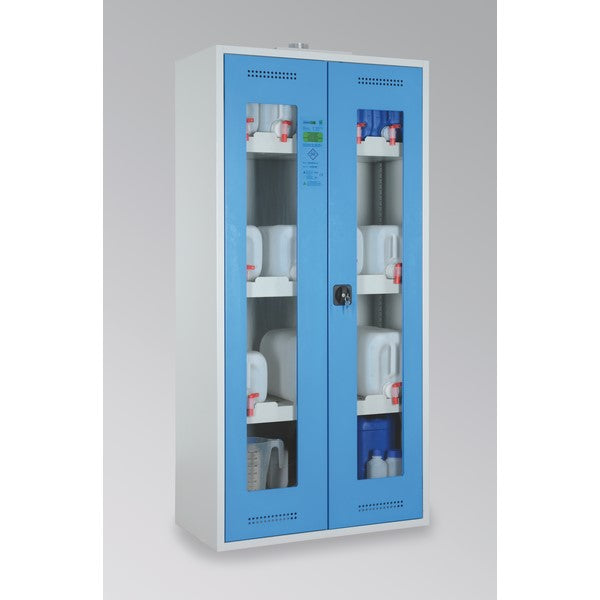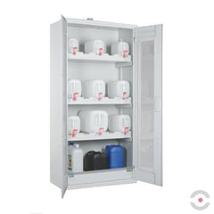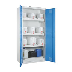 Dwudrzwiowa szafa przeznaczona do bezpiecznego przechowywania oraz opróżniania kanistrów z substancjami niebezpiecznymi chemicznie, stanowiących zagrożenie dla środowiska, wykorzystywanych na stanowiskach pracy w zamkniętych pomieszczeniach. Rozwiązanie to umożliwia wygodne składowanie materiałów niebezpiecznych bezpośrednio w pobliżu miejsca ich użytkowania.