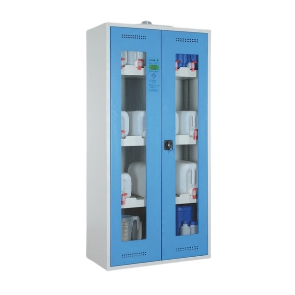 Dwudrzwiowa szafa przeznaczona do bezpiecznego przechowywania oraz opróżniania kanistrów z substancjami niebezpiecznymi chemicznie, stanowiących zagrożenie dla środowiska, wykorzystywanych na stano...
