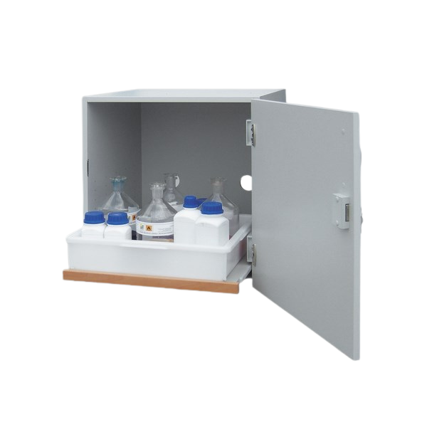 Szafa zabezpieczająca na kwasy, zasady, roztwory alkaliczne i inne niebezpieczne chemikalia do ustawienia pod blatem. Jest niezbędna wszędzie tam, gdzie wykorzystywane i składowane są substancje niebezpieczne na stanowisku pracy. Rozwiązanie to umożliwia wygodne składowanie materiałów niebezpiecznych bezpośrednio w pobliżu miejsca ich użytkowania.