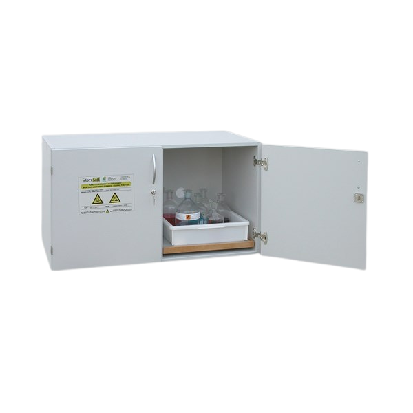 Szafa zabezpieczająca na kwasy, zasady, roztwory alkaliczne i inne niebezpieczne chemikalia do ustawienia pod blatem. Jest niezbędna wszędzie tam, gdzie wykorzystywane i składowane są substancje niebezpieczne na stanowisku pracy. Rozwiązanie to umożliwia wygodne składowanie materiałów niebezpiecznych bezpośrednio w pobliżu miejsca ich użytkowania.