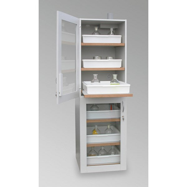 Dwukomorowa szafa stojąca, wąska przeznaczona do magazynowania kwasów, zasad, roztworów alkalicznych i innych niebezpiecznych chemikaliów wykorzystywanych na stanowiskach pracy w zamkniętych pomieszczeniach i przechowywanych w niewielkich opakowaniach. Rozwiązanie to umożliwia wygodne składowanie materiałów niebezpiecznych bezpośrednio w pobliżu miejsca ich użytkowania.