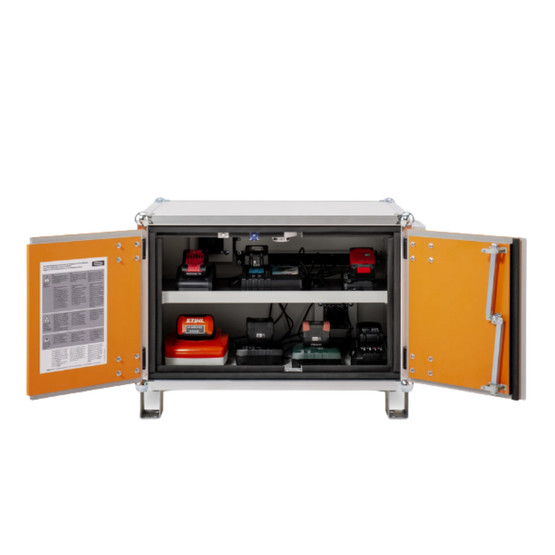 Szafa zabezpieczająca, przeciwwybuchowa z gniazdami do ładowania przeznaczona jest do przechowywania i ładowania akumulatorów litowo-jonowych. Zgodnie z wytycznymi VDMA szafa musi wytrzymać działanie płomieni i ciśnienia przez cały czas trwania pożaru, aż do całkowitego wypalenia się baterii. Test uznaje się za zaliczony, jeśli szafa skutecznie powstrzymuje ogień i nie dopuszcza do wydostania się płomieni na zewnątrz.