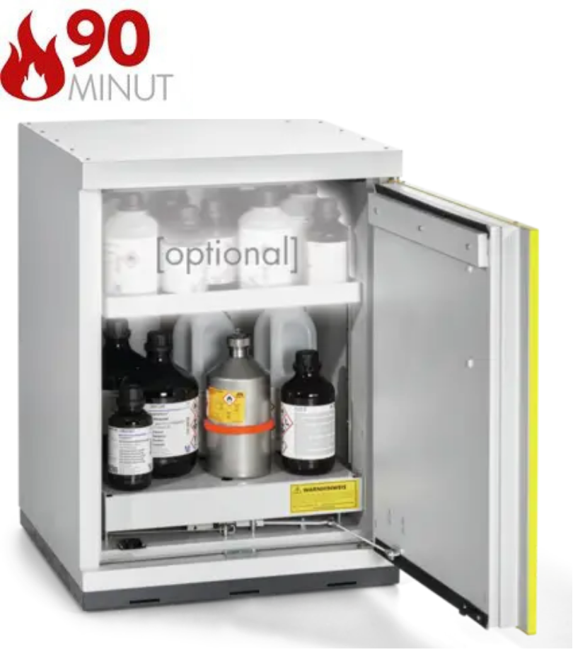 Szafa ognioodporna 90-minutowa podblatowa służy do bezpiecznego, pasywnego składowania materiałów łatwopalnych (niebezpiecznych) w pojemnikach o różnej pojemności w pomieszczeniach roboczych (laboratoria, hale produkcyjne). Umożliwia przechowywanie substancji w pobliżu stanowiska pracy, pod blatami roboczymi. Profesjonalne rozwiązanie spełniające najwyższe normy polskie i europejskie, eliminujące potrzebę budowania oddzielnych pomieszczeń magazynowych.