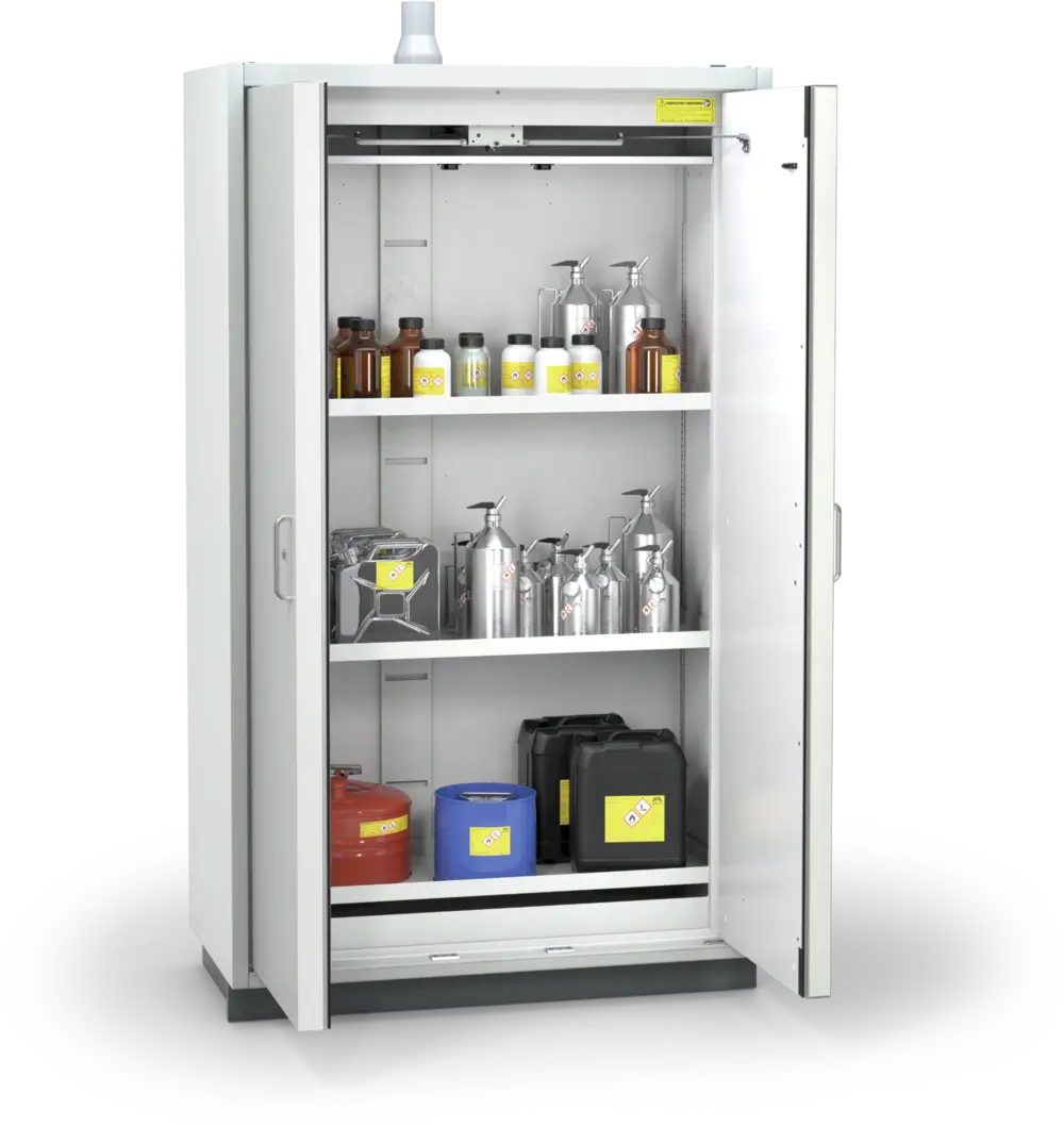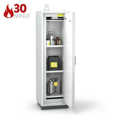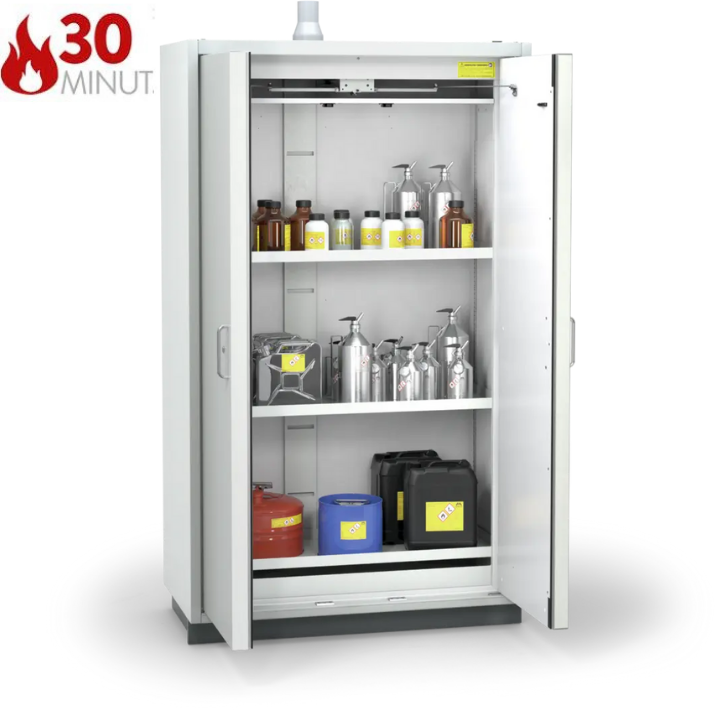 Szafa ognioodporna 30 min przeznaczona do bezpiecznego, ekonomicznego i pasywnego składowania materiałów łatwopalnych (niebezpiecznych) w pojemnikach o różnej pojemności, w pomieszczeniach roboczych (laboratoria, hale produkcyjne), w pobliżu stanowiska pracy. Profesjonalne rozwiązanie spełniające najwyższe normy polskie i europejskie, eliminujące potrzebę budowania oddzielnych pomieszczeń magazynowych.