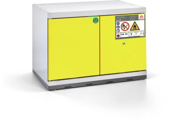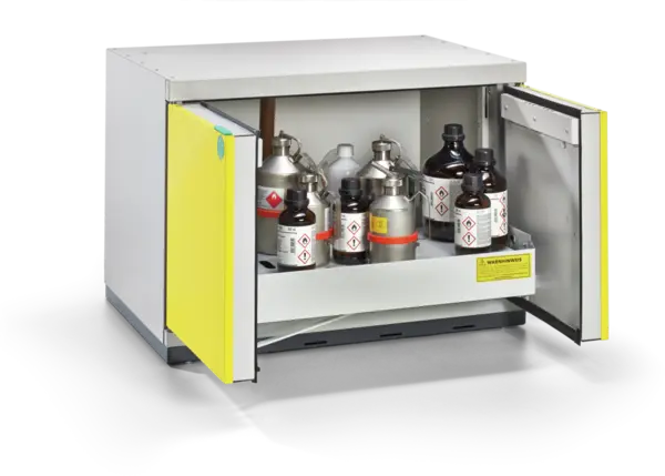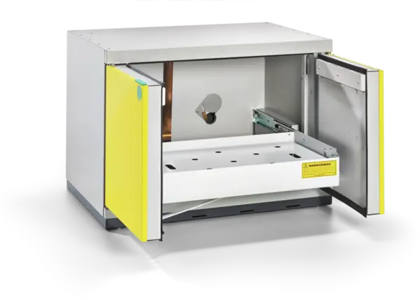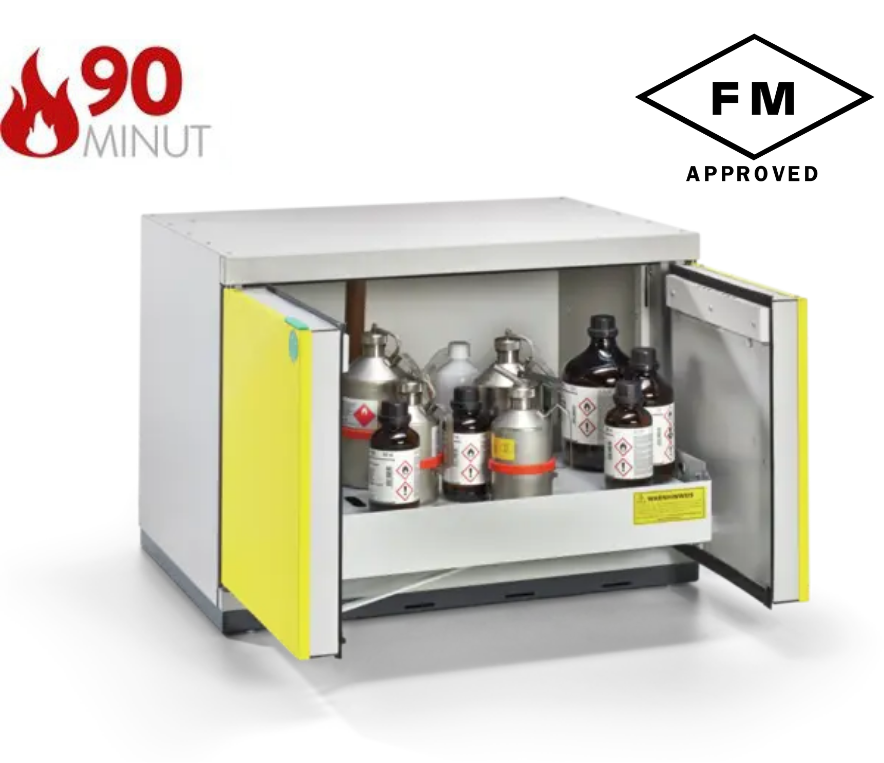 Szafa ognioodporna 90-minutowa podblatowa służy do bezpiecznego, pasywnego składowania materiałów łatwopalnych (niebezpiecznych) w pojemnikach o różnej pojemności w pomieszczeniach roboczych (labor...