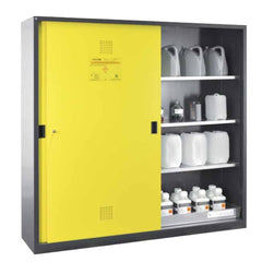 Szafa stojąca z drzwiami przesuwnymi przeznaczona do bezpiecznego przechowywania chemikaliów stanowiących zagrożenie dla środowiska, wykorzystywanych na stanowiskach pracy w zamkniętych pomieszczen...