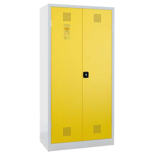 Dwudrzwiowa szafa przeznaczona do bezpiecznego przechowywania substancji niebezpiecznych chemicznie, stanowiących zagrożenie dla środowiska, w beczkach 60 l i w małych opakowaniach, wykorzystywanych na stanowiskach pracy w zamkniętych pomieszczeniach. Rozwiązanie to umożliwia wygodne składowanie materiałów niebezpiecznych bezpośrednio w pobliżu miejsca ich użytkowania.