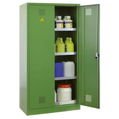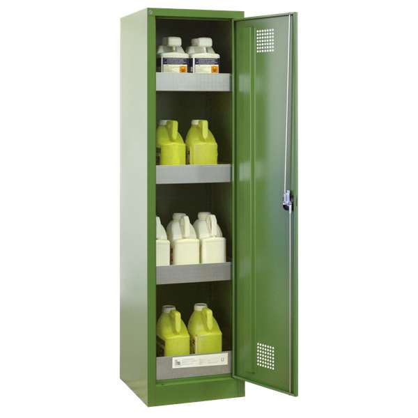 Jednodrzwiowa szafa stojąca, wąska, przeznaczona do bezpiecznego przechowywania substancji agrochemicznych i i innych chemikaliów stanowiących zagrożenie dla środowiska, wykorzystywanych na stanowiskach pracy w zamkniętych pomieszczeniach i przechowywanych w niewielkich opakowaniach. Idealnie sprawdza się w zakładach przemysłowych, warsztatach, magazynach i gospodarstwach rolnych.