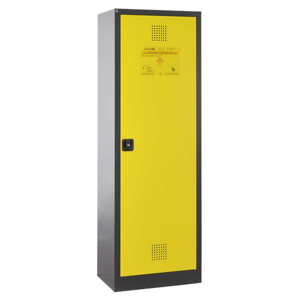 Jednodrzwiowa szafa stojąca, wąska przeznaczona do bezpiecznego przechowywania chemikaliów stanowiących zagrożenie dla środowiska, wykorzystywanych na stanowiskach pracy w zamkniętych pomieszczeniach i przechowywanych w niewielkich opakowaniach. Rozwiązanie to umożliwia wygodne składowanie materiałów niebezpiecznych bezpośrednio w pobliżu miejsca ich użytkowania.