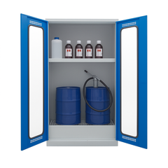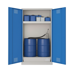 Dwudrzwiowa szafa przeznaczona do bezpiecznego przechowywania substancji niebezpiecznych chemicznie, stanowiących zagrożenie dla środowiska, w beczkach 60 l i w małych opakowaniach, wykorzystywanyc...