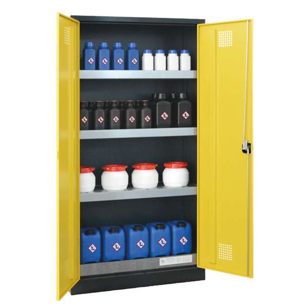 Dwudrzwiowa szafa stojąca przeznaczona do bezpiecznego przechowywania chemikaliów stanowiących zagrożenie dla środowiska, wykorzystywanych na stanowiskach pracy w zamkniętych pomieszczeniach i przechowywanych w niewielkich opakowaniach. Rozwiązanie to umożliwia wygodne składowanie materiałów niebezpiecznych bezpośrednio w pobliżu miejsca ich użytkowania.