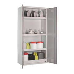Dwudrzwiowa szafa stojąca, przeznaczona do bezpiecznego przechowywania chemikaliów stanowiących zagrożenie dla środowiska, wykorzystywanych na stanowiskach pracy w zamkniętych pomieszczeniach i prz...