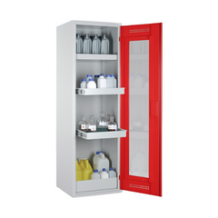Jednodrzwiowa szafa stojąca, wąska przeznaczona do bezpiecznego przechowywania chemikaliów stanowiących zagrożenie dla środowiska, wykorzystywanych na stanowiskach pracy w zamkniętych pomieszczeniach i przechowywanych w niewielkich opakowaniach. Rozwiązanie to umożliwia wygodne składowanie materiałów niebezpiecznych bezpośrednio w pobliżu miejsca ich użytkowania.