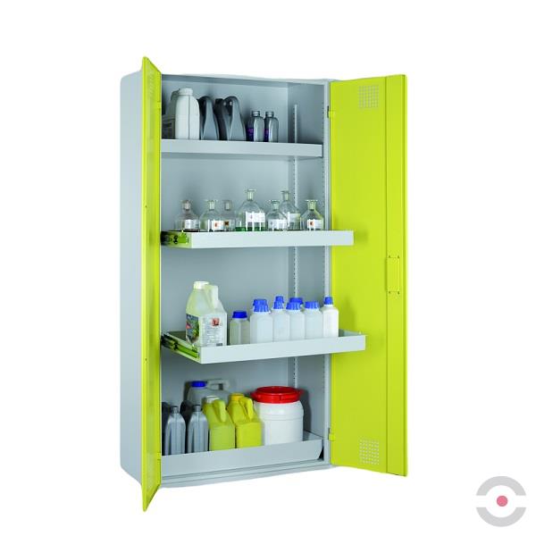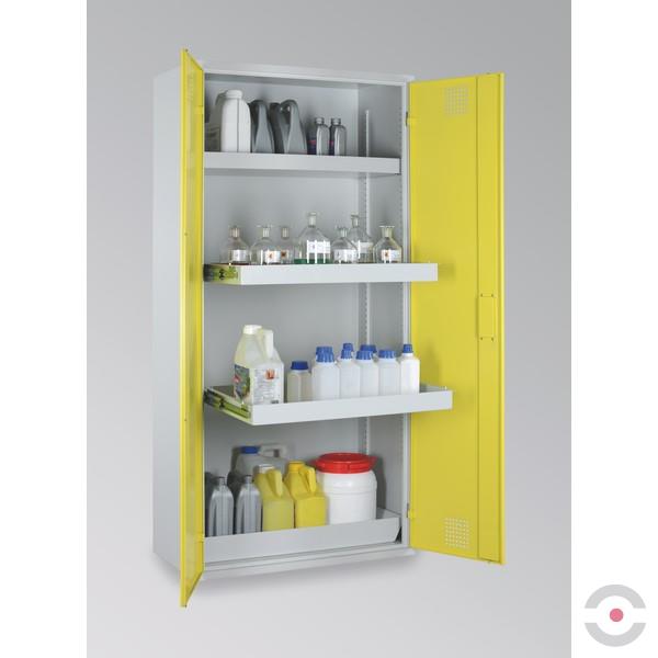 Dwudrzwiowa szafa stojąca, przeznaczona do bezpiecznego przechowywania chemikaliów stanowiących zagrożenie dla środowiska, wykorzystywanych na stanowiskach pracy w zamkniętych pomieszczeniach i prz...