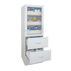 Dwukomorowa szafa stojąca, wąska przeznaczona do magazynowania kwasów, zasad, roztworów alkalicznych i innych niebezpiecznych chemikaliów wykorzystywanych na stanowiskach pracy w zamkniętych pomieszczeniach i przechowywanych w niewielkich opakowaniach. Rozwiązanie to umożliwia wygodne składowanie materiałów niebezpiecznych bezpośrednio w pobliżu miejsca ich użytkowania.