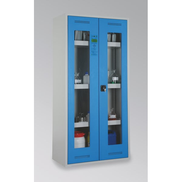 Dwudrzwiowa szafa stojąca, przeznaczona do bezpiecznego przechowywania chemikaliów stanowiących zagrożenie dla środowiska, wykorzystywanych na stanowiskach pracy w zamkniętych pomieszczeniach i prz...