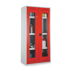 Dwudrzwiowa szafa stojąca, przeznaczona do bezpiecznego przechowywania chemikaliów stanowiących zagrożenie dla środowiska, wykorzystywanych na stanowiskach pracy w zamkniętych pomieszczeniach i przechowywanych w niewielkich opakowaniach. Rozwiązanie to umożliwia wygodne składowanie materiałów niebezpiecznych bezpośrednio w pobliżu miejsca ich użytkowania.