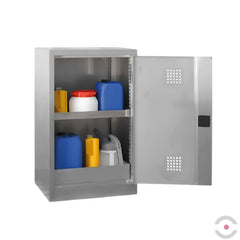 Szafa ze stali nierdzewnej przeznaczona do bezpiecznego przechowywania substancji niebezpiecznych dla wody oraz agresywnych substancji chemicznych w małych pojemnikach, stosowana w pomieszczeniach ...