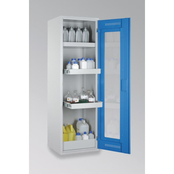 Jednodrzwiowa szafa stojąca, wąska przeznaczona do bezpiecznego przechowywania chemikaliów stanowiących zagrożenie dla środowiska, wykorzystywanych na stanowiskach pracy w zamkniętych pomieszczeniach i przechowywanych w niewielkich opakowaniach. Rozwiązanie to umożliwia wygodne składowanie materiałów niebezpiecznych bezpośrednio w pobliżu miejsca ich użytkowania.