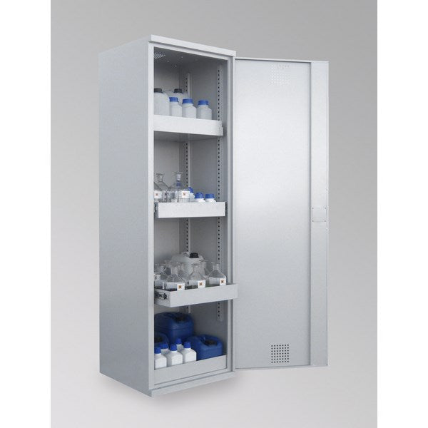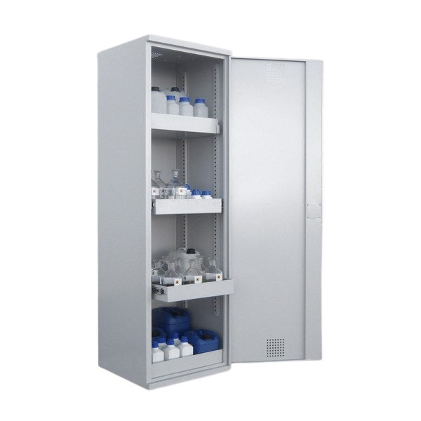 Jednodrzwiowa szafa stojąca, wąska przeznaczona do bezpiecznego przechowywania chemikaliów stanowiących zagrożenie dla środowiska, wykorzystywanych na stanowiskach pracy w zamkniętych pomieszczeniach i przechowywanych w niewielkich opakowaniach. Rozwiązanie to umożliwia wygodne składowanie materiałów niebezpiecznych bezpośrednio w pobliżu miejsca ich użytkowania.