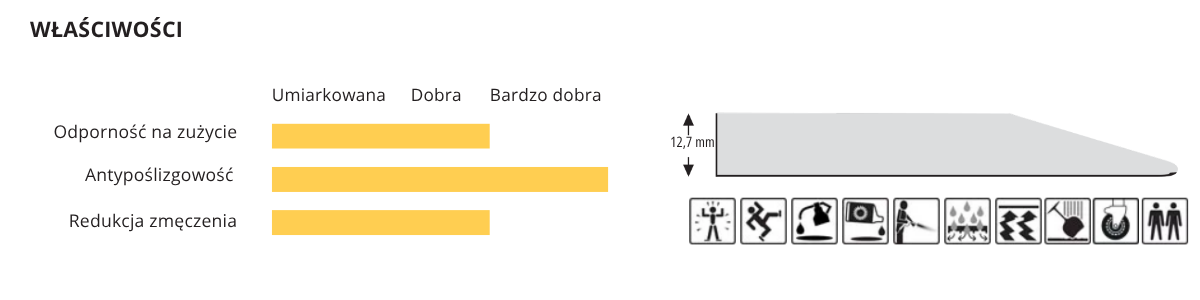 Wykładzina przemysłowa, ergonomiczna do stosowania w środowiskach mokrych i suchych o średnio intensywnym użytkowaniu. Przeznaczona do zastosowań przemysłowych, w przetwórstwie żywności, profesjonalnych kuchniach i gastronomii. Może być również wykorzystywana jako mata wejściowa na zewnątrz.