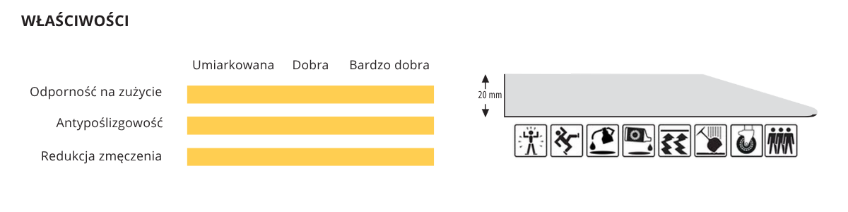 - Bardzo dobre właściwości ergonomiczne — platforma robocza o wysokości 20 mm redukuje zmęczenie nóg i kręgosłupa.