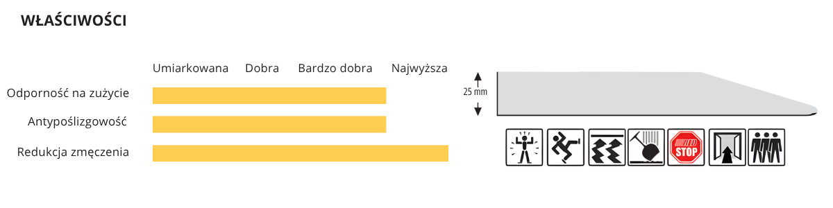 - Pochłania obciążenie punktowe, a także wibracje całego ciała pracowników stojących wokół maszyn, wózków widłowych i platform
