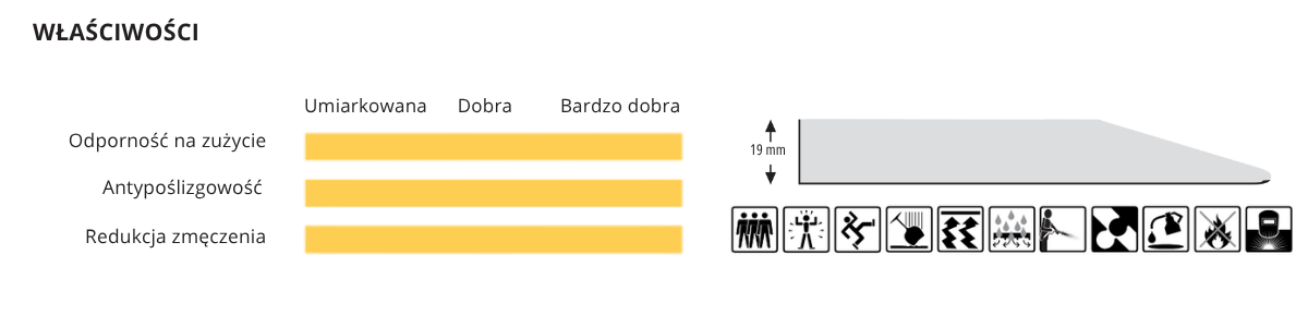 Ergonomiczna mata podłogowa o modułowej konstrukcji przeznaczona do miejsc mokrych i zaolejonych o wysokiej intensywności użytkowania, sprawdza się w środowisku przemysłowym, przemyśle spożywczym, profesjonalnych kuchniach oraz gastronomii. Dzięki zmniejszonej palności mata nadaje się również na stanowiska spawalnicze.