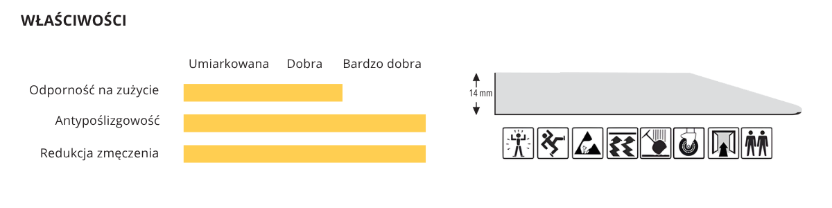 Ergonomiczna wykładzina przemysłowa, wykonana z pianki poliuretanowej, do stosowania w środowisku suchym, o średnio intensywnym użytkowaniu.