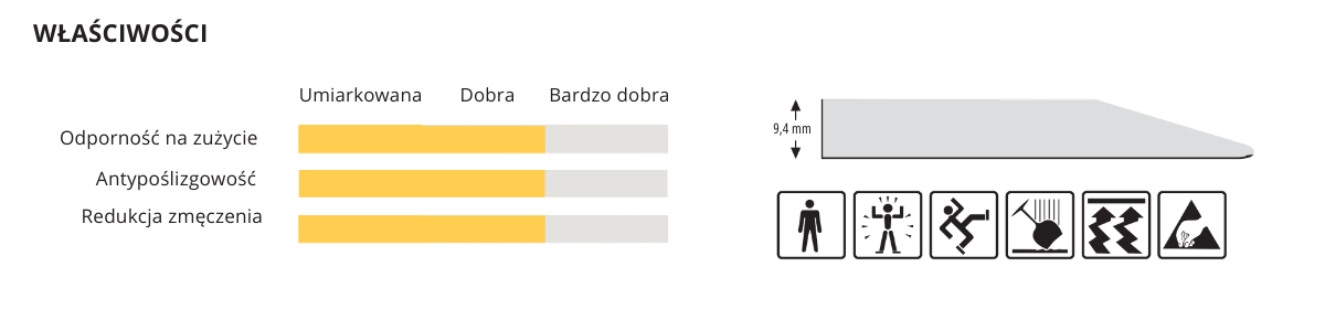 Ergonomiczna, przeciwzmęczeniowa pianka PVC z Dyna-Shield® zapewnia komfort i wsparcie oraz eliminuje ryzyko przesuwania się mat na gładkich powierzchniach podłóg