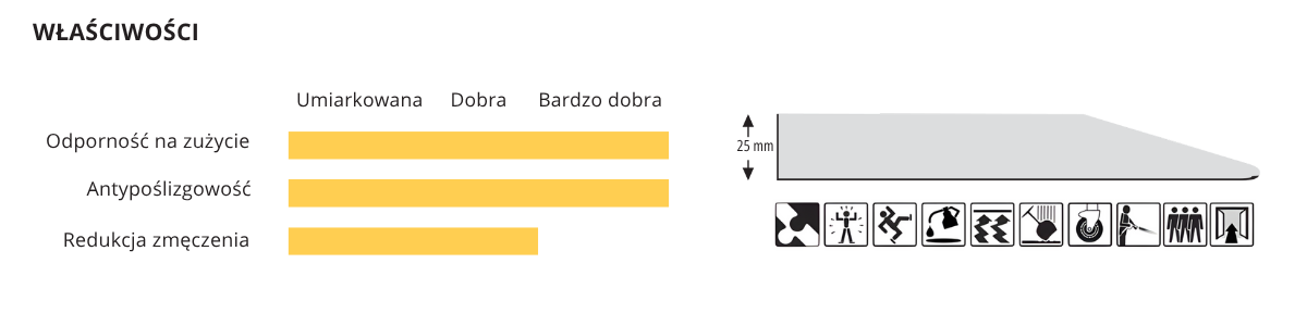 - Maty posiadają ryflowaną, antypoślizgową powierzchnię, a dzięki konstrukcji „flex” pod matą oraz elastycznej platformie roboczej o wysokości 25 mm zapewniają dobre właściwości przeciwzmęczeniowe.