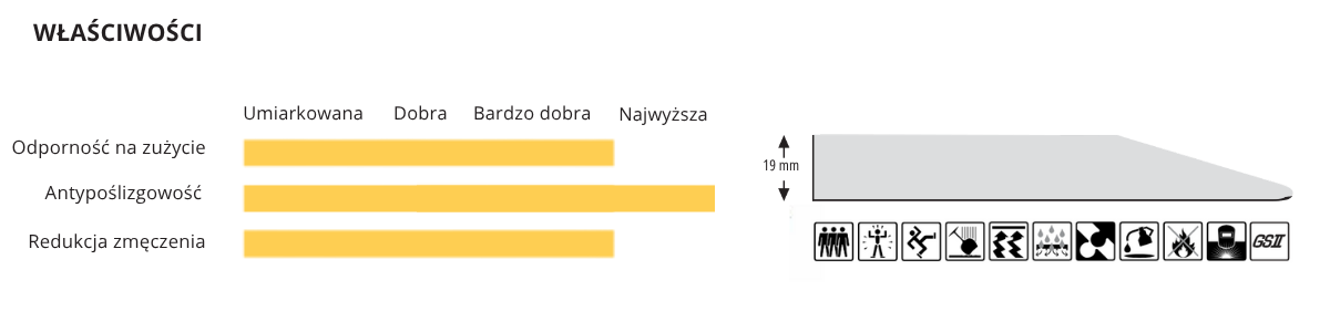 Ergonomiczna mata podłogowa o modułowej konstrukcji przeznaczona do miejsc mokrych i zaolejonych o wysokiej intensywności użytkowania, sprawdza się w środowisku przemysłowym, przemyśle spożywczym, profesjonalnych kuchniach oraz gastronomii. Dzięki zmniejszonej palności mata nadaje się również na stanowiska spawalnicze.