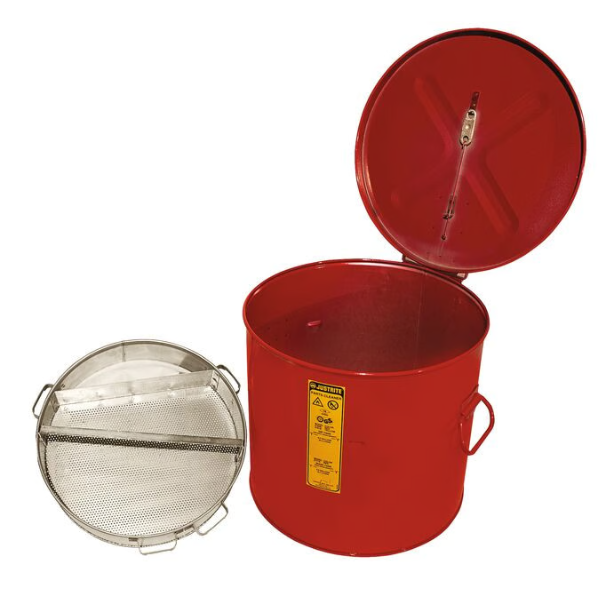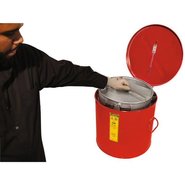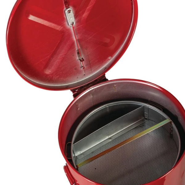 Pojemnik zabezpieczający Justrite stalowy na odpady olejowe, dźwignia nożna, 34 l, czerwony