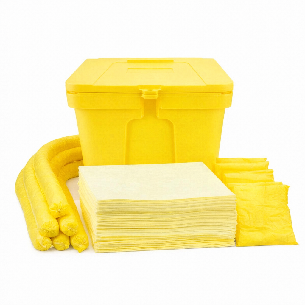 Zestaw stanowiskowy wyposażony w sorbenty chemiczne polipropylenowe (żółte) służy do pochłaniania agresywnych chemikaliów, wszelkiego typu cieczy od płynów przemysłowych, przez produkty ropopochodne. Zapewnia natychmiastowy dostęp do sorbentów o zróżnicowanych kształtach, co umożliwia natychmiastowe rozpoczęcie usuwania lub ograniczania nagłych wycieków zarówno wewnątrz pomieszczeń, jak i na zewnątrz.