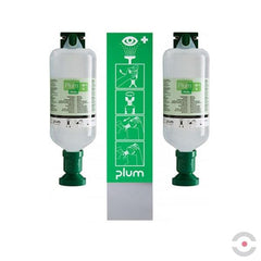 Zestaw naścienny składający się z dwóch butelek płynu do płukania oczu PLUM EYE WASH 500 ml, umieszczonych w wygodnej stacji naściennej wyposażonej w lusterko i tabliczkę informacyjną ze skróconą instrukcją stosowania.